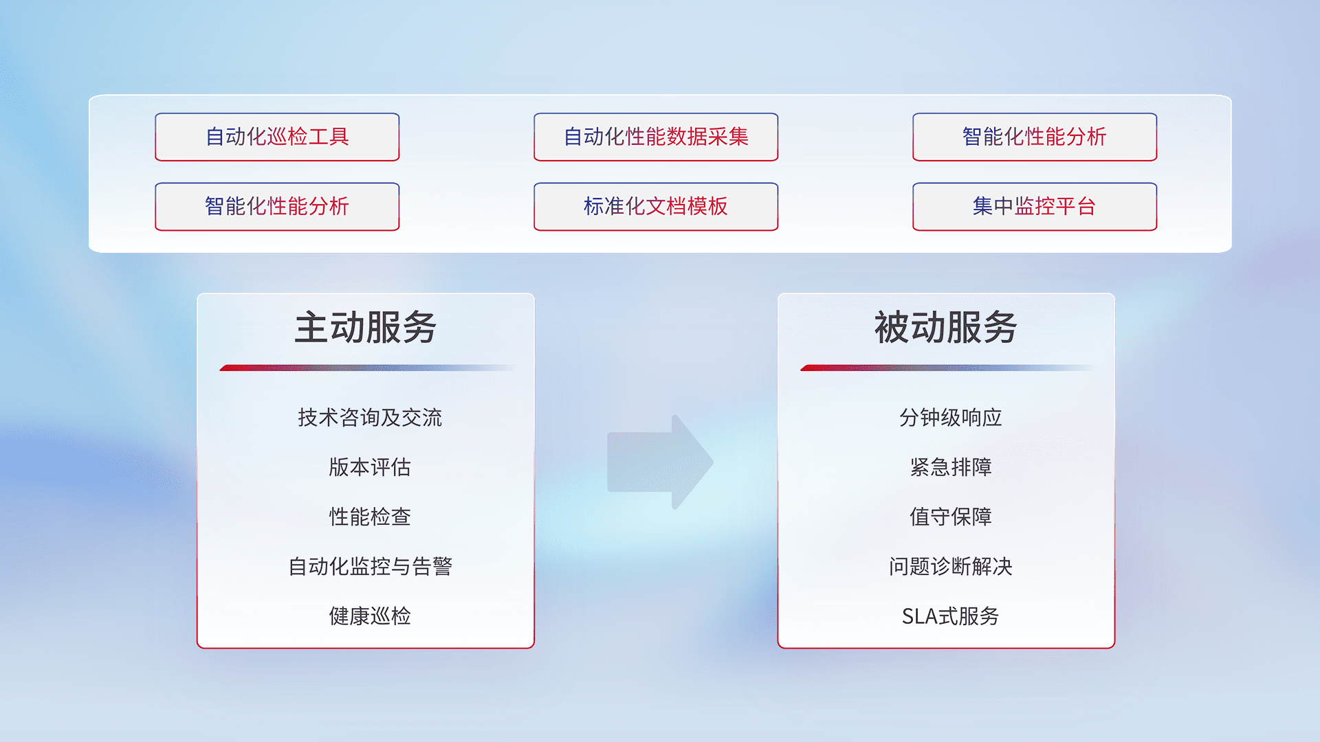 智能化工具和标准化文档,,,保障服务质量,,,,提供主动服务(包含技术咨询、、版本评估、、、、性能检查、、、、自动化监控与告警、、、、健康巡检)和被动服务包含(分钟级响应、、、、紧急排障、、值守保障、、、、问题诊断解决、、、SLA服务)。。